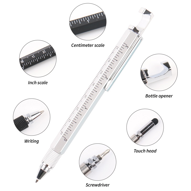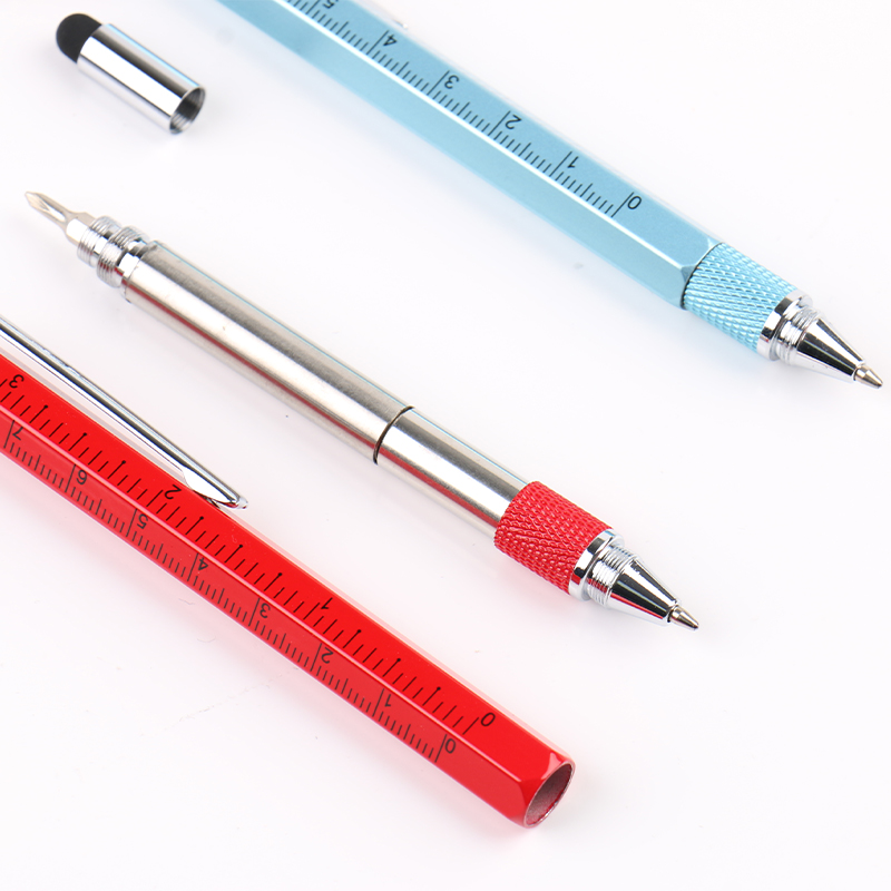 1. Multifunction pen tool features a handy tablet or smartphone stylus, a sturdy screwdriver, a bubble level, a universal inch/cm ruler